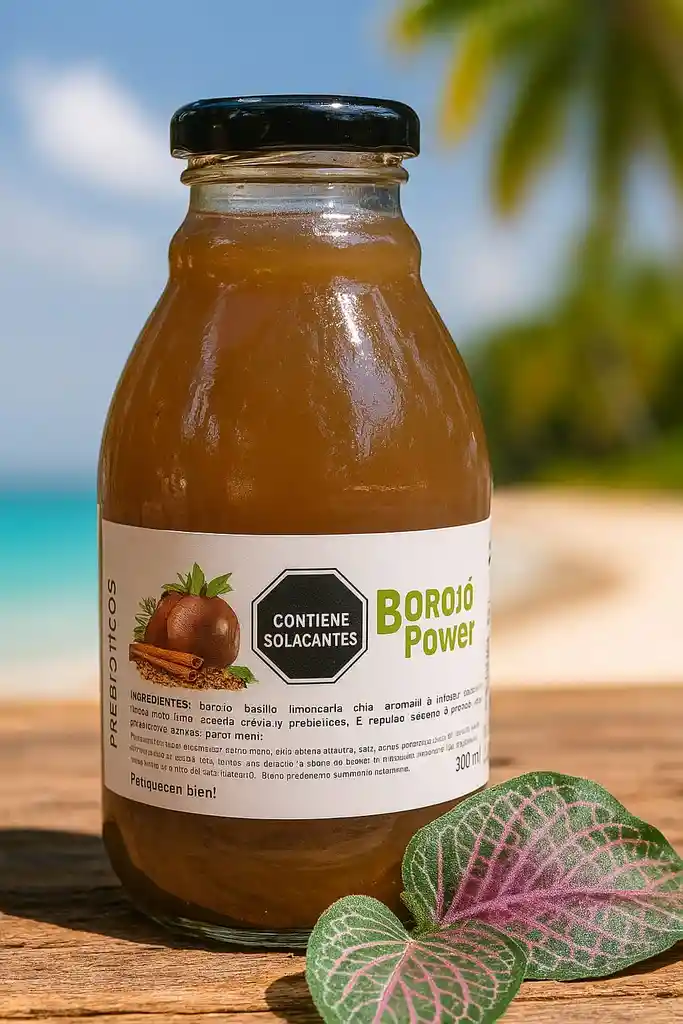 Bebida de limón con borojó, albahaca, semillas de chía y anulina de Achicoria Un sabor exótico y funcional que une el borojó con hierbas aromáticas y inulina de achicoria. El borojó es reconocido como un energizante natural. Aporta vitaminas y minerales que nutren cuerpo y mente. La albahaca y limonaria favorecen la digestión y la calma. Una bebida única para revitalizar y nutrir de forma natural.