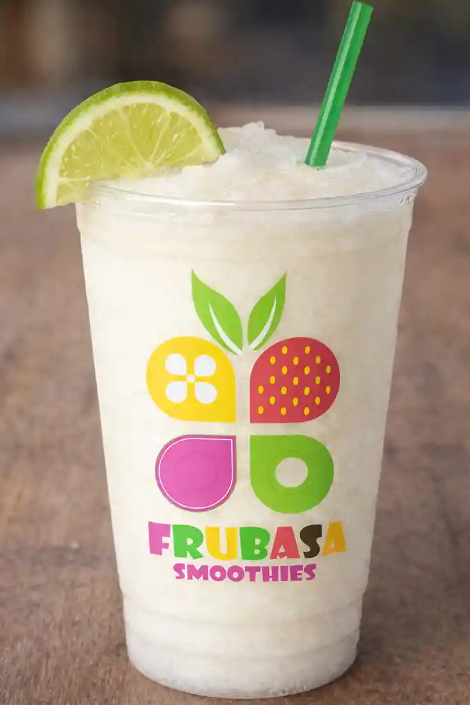 LIMONADA DE COCO TIPO GRANIZADA CON HIELO Y LIMON Y UNA RODAJA DE LIMON VASO DE 16 0NZAS BATIDA EN LECHE ENTERA