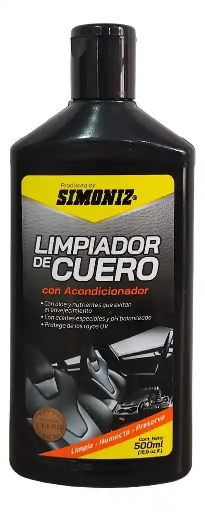 Limpiador Silletería Cuero Vehículo Restaura Brillo Acondicionador Ideal para mantener la tapicería de cuero de tu vehículo en perfecto estado, proporcionando brillo y protección con cada uso, y asegurando una apariencia impecable. DESCRIPCIÓN Este Limpiador de Silletería de Cuero Simoniz de 500 ml es un producto diseñado para restaurar, proteger y mantener la tapicería de cuero en vehículos y otras superficies de cuero. Con su fórmula enriquecida con aloe y nutrientes, este limpiador no solo limpia, sino que también acondiciona el cuero, devolviéndole su brillo natural y previniendo el envejecimiento. El producto forma una capa protectora que bloquea los dañinos rayos UV, prolongando la vida útil del cuero y evitando grietas y decoloraciones. Es ideal para el mantenimiento regular de la tapicería de cuero, asegurando que siempre luzca como nueva. Para su uso, simplemente agite bien el producto, aplique una cantidad adecuada en un paño limpio y seco, y frote la superficie hasta lograr un acabado brillante y reluciente. CARACTERÍSTICAS - Restaura el brillo del cuero - Protección contra rayos UV - Fórmula con aloe y nutrientes - pH balanceado - Contiene aceites especiales - Previene el envejecimiento del cuero - Hidrata y preserva - Multiuso para superficies de cuero - Acondicionador integrado - Fácil de aplicar Medidas: Largo: 4,5 cm Ancho: 9,5 cm Alto: 22 cm Peso: 560 g QUE INCLUYE LA COMPRA x1 Limpiador Cuero