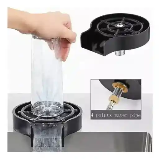Nuestro limpiador de vasos tiene un chorro de alta presión de cinco agujeros, que puede limpiar las tazas desde múltiples ángulos, más rápido y más limpio. En el momento de presionar el enjuague, hay suficiente presión y agua para enjuagar todas las esquinas de las tazas, y también se pueden limpiar manchas difíciles como manchas de té y manchas de café. Es ideal para los fregaderos de cocina y muy fácil de operar Utiliza limpieza a alta presión y multiángulo para enjuagar residuos de copas, vasos y tazas en segundos. Su diseño compacto se adapta a la mayoría de las bachas o fregaderos de cocina. Está diseñado para ahorrar tiempo, agua y energía. Simplemente se coloca el vaso boca abajo sobre el enjuagador y se empuja suavemente para activarlo. Se requiere instalación, posiblemente por un plomero, para conectarlo al suministro de agua.