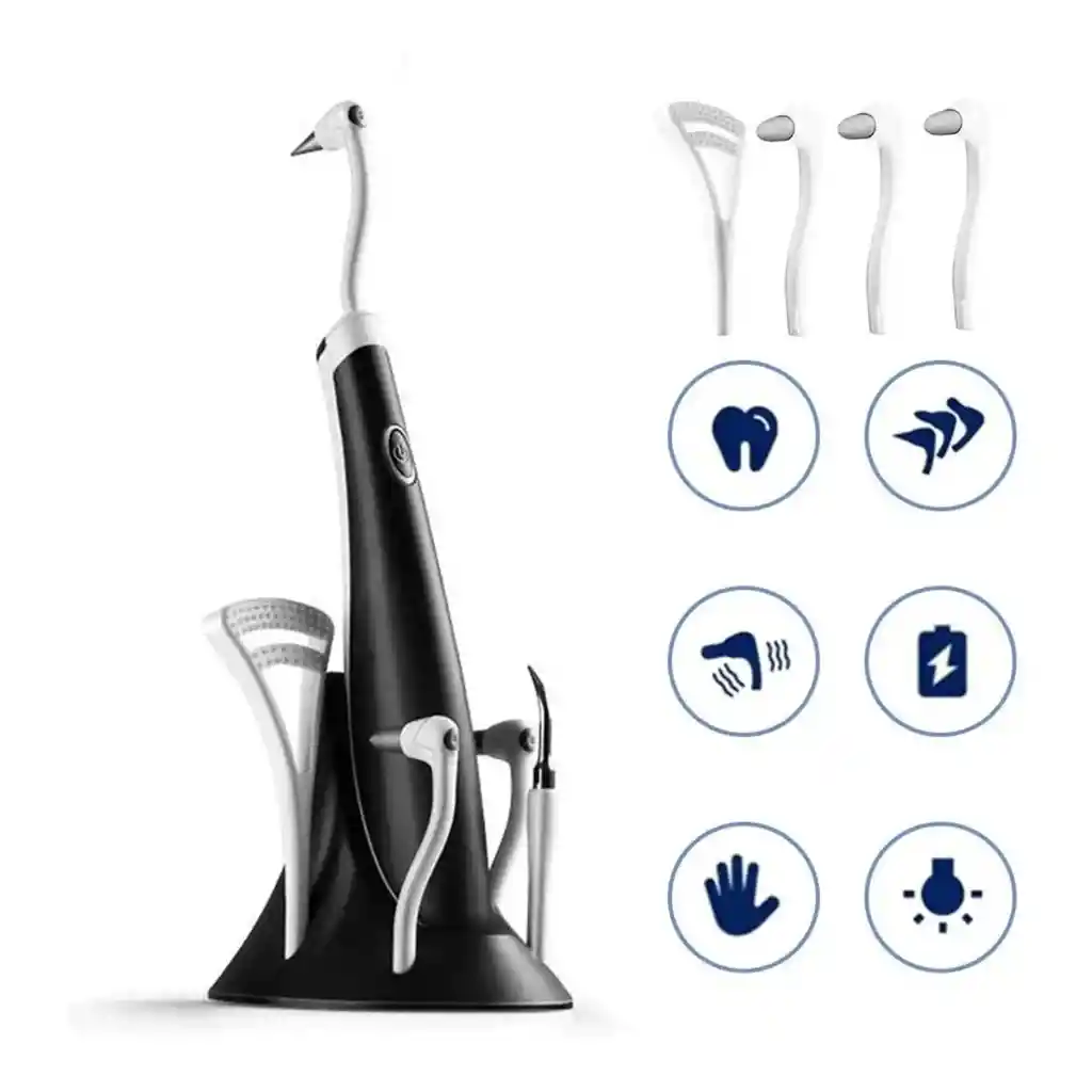 Herramienta de eliminación de placa dental con tecnología de vibración sónica real de alta frecuencia (algunos clientes pueden pensar que la máquina no funciona porque no tiene vibración ni sonido de funcionamiento, si tienes dudas similares, pruébala en tus dientes u otros objetos duros) *Primero con herramientas dentales. Vuelve y vuelve en una pequeña zona durante unos cuantos movimientos y espera hasta que te acostumbres a la sensación. *Para eliminar el 99.99 % de los restos de comida escondidos profundamente, masajear con eficacia las encías y estimular la circulación sanguínea. También es útil para combatir el sangrado de encías y el mal aliento, además de servir para el cuidado de frenillos y puentes. *Material: Plástico ABS *Funciona Con Pila AAA *Inalámbrico y ligero, este Limpiador removedor dental es ideal para viajes e incluye 5 boquillas intercambiables para toda tu familia.