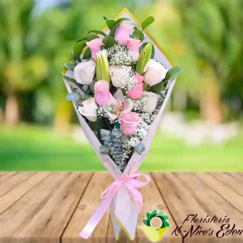 Dale un toque de ternura y romanticismo a cualquier ocasión con este delicado bouquet en tonos pastel. Compuesto por 12 rosas entre rosadas y blancas, Orquidea, lirios y elegantes detalles de gypsophila, este arreglo transmite pureza, dulzura y amor sincero. Su capa en papel con tonos claros y cinta rosada lo convierten en el detalle ideal para sorprender a tu persona especial en cumpleaños, aniversarios o para expresar cariño y gratitud en cualqiuier ocasión. Un regalo encantador que ilumina corazones y crea recuerdos inolvidables.