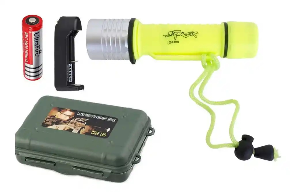Linterna sumergible en kit completo. practica para transportar y usar.Especificaciones:- Color: Amarillo- Material: Plástico- Luz: LED- Profundidad: 50 metros aprox.- Batería: 1 x 18650 / 4 x AAAContenido del paquete:- 1 x Linterna sumergible- 1 x Cargador 18650- 1 x Batería 18650- 1 x Adaptador baterías AAA- 1 x Caja