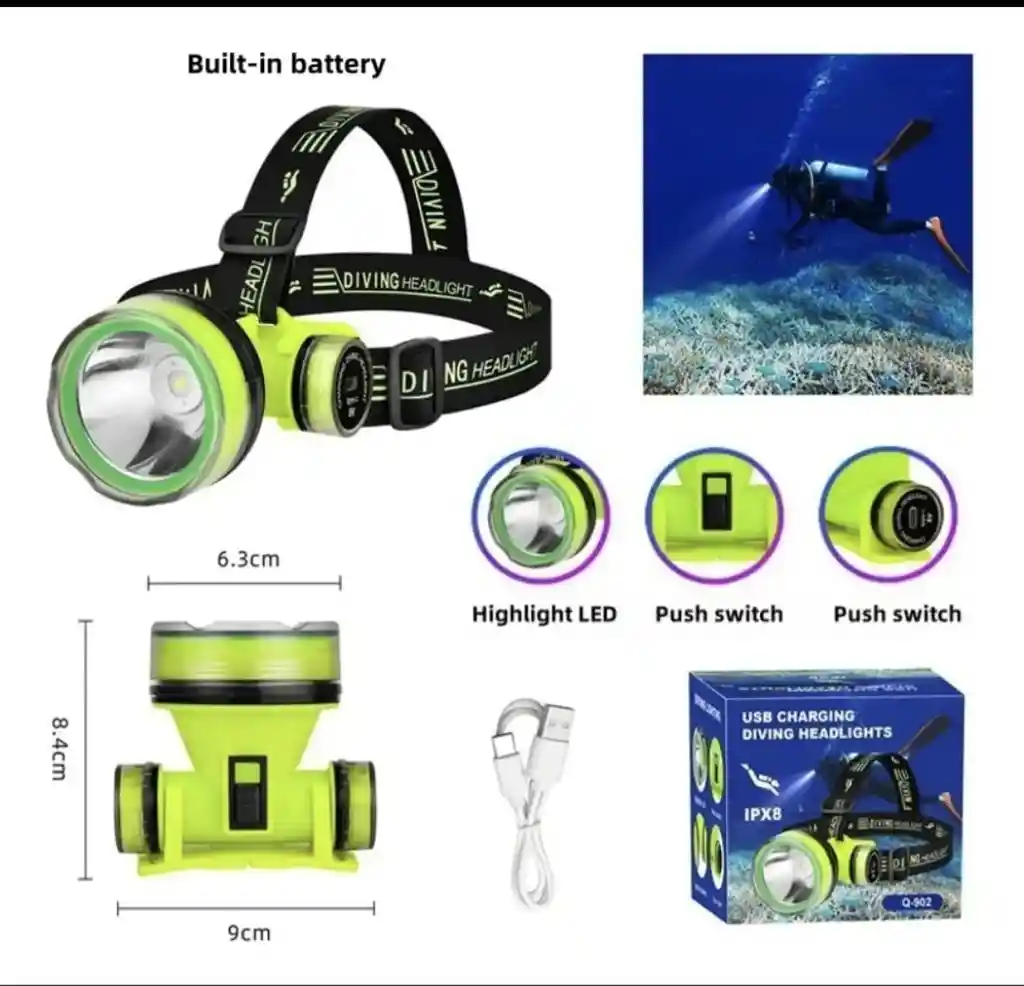 descripción del producto: faro de buceo profesional Material: plástico ABS Batería: batería de litio 18650 incorporada Método de carga: tipo C Resistencia de carga: 3 horas con luz brillante, 5 horas con poca luz Potencia: linterna de buceo impermeable de 30 W, color anfibio: amarillo fluorescente y negro batería de litio 186501 perlas de lámpara: LED