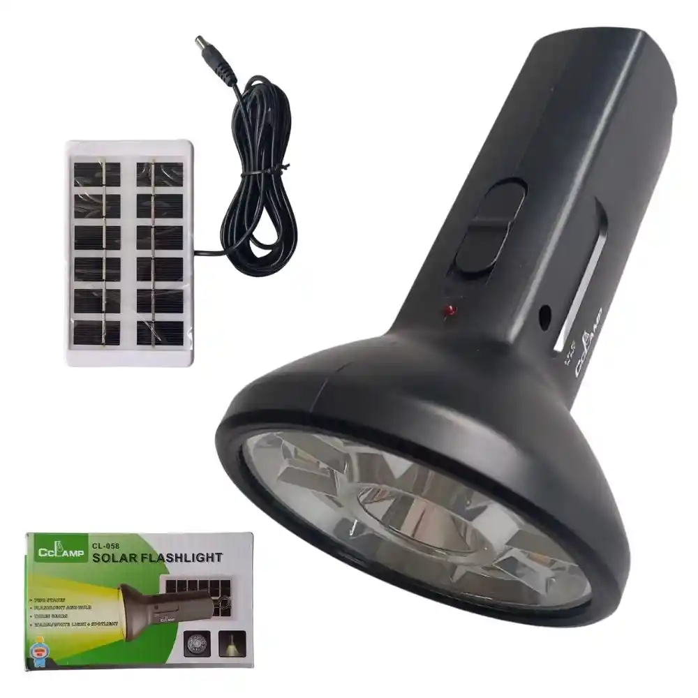 Poderosa Linterna CCLAMP CL-058 con concentración de luz LED. Cuenta con 3 modos de iluminación, luz blanca focal, luz alta blanca y luz cálida alta. Su batería es recargable y trae su panel solar para cargarla. Ideal para su seguridad en carretera, caminatas, deportes como tiro al blanco, pesca, paseos, camping, e infinidad de usos. CARACTERÍSTICAS Luz LED 3 modos de iluminacion: luz blanca focal, luz alta blanca y luz cálida alta Botón: OFF / Focal / Alta blanca / Alta cálida Luz indicadora de carga Batería incorporada recargable con panel solar Linterna: 3W. Batería: 800mAh Iluminación LED alta potencia. Aspecto atractivo. Diseño duradero. Ideal para su seguridad. CONTENIDO 1 linterna CCLAMP CL-058 1 panel solar