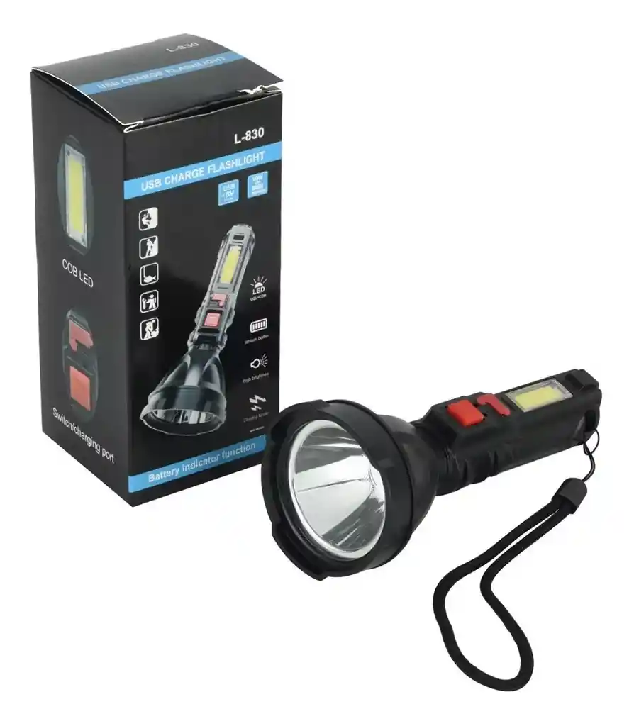 Disfruta de contar con la linterna ideal para todas tus necesidades. Fabricada con materiales resistentes y de calidad se adaptará a todas las situaciones en las que necesites contar con buena iluminación. A prueba de agua Esta linterna es resistente a situaciones climáticas adversas o a probables derrames de agua sobre ellas. Sus materiales duraderos y la calidad en su composición hacen que sea una gran opción para tener en el hogar. Tipo de alimentación: batería. Tipo de luz: osl cob led Potencia: 1000lm. Alcance de proyección: 100m. Es recargable. Es a prueba de agua. Material: abs. Ilumina todos los espacios fácilmente.