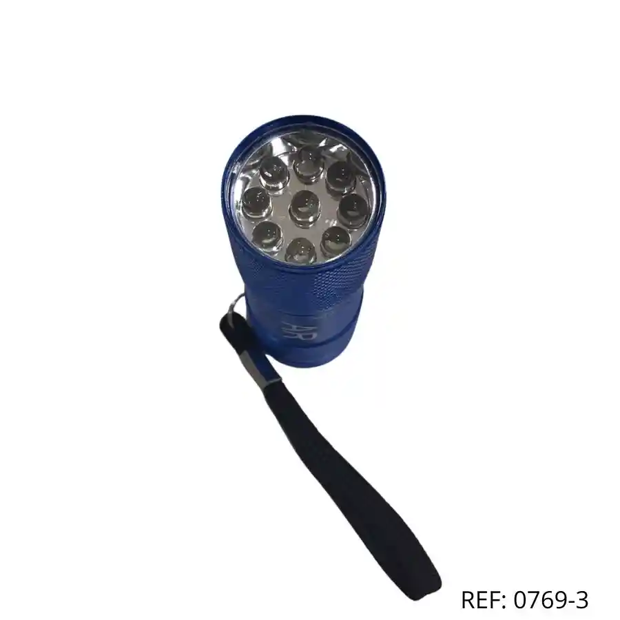 Linterna portátil azul con 9 luces LED. Perfecta para uso diario, viajes o cortes de luz.