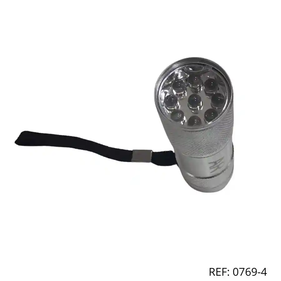 Linterna metálica plateada con LED brillante y correa. Tamaño práctico para llevar a todas partes.