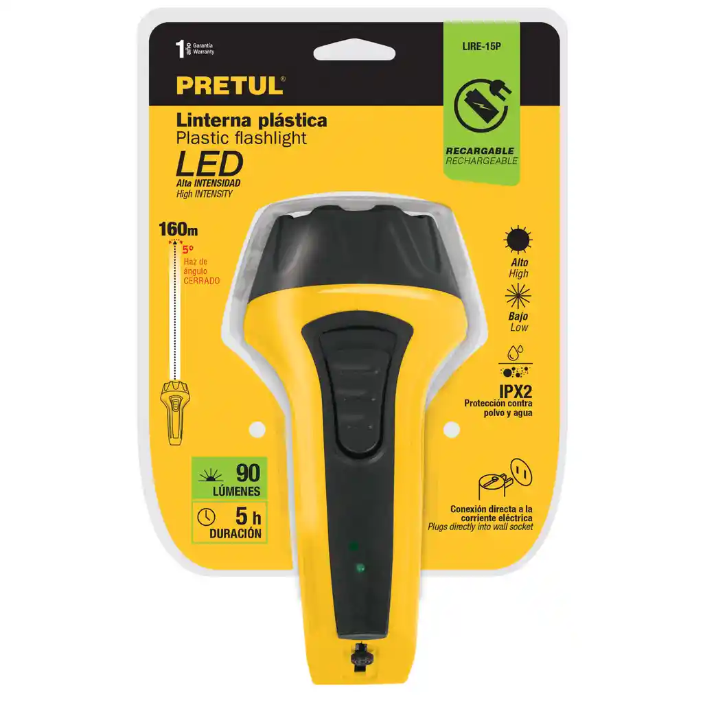 Haz de luz de largo alcance: 160 m Modos de iluminación: Alto y bajo Duración de 5 horas en modo bajo Batería recargable de litio de 3.7 V c.c. LED de alta luminosidad