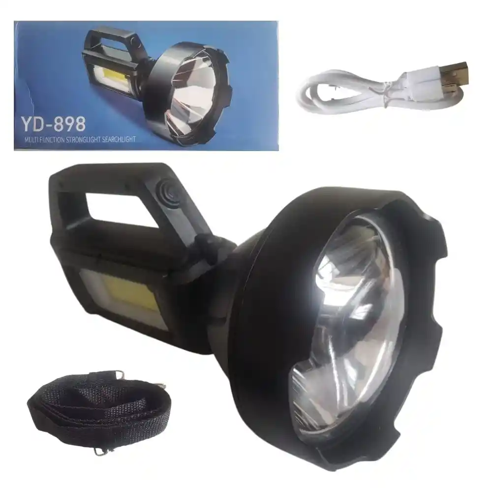 Poderosa Linterna Recargable YD-898, concentración de luz led. 2 linternas en 1: frontal y lateral. La linterna frontal tiene 3 modos de luz blanca (alta, baja y strober) y la linterna lateral tiene 2 modos de luz blanca (alta, baja) y 1 modo de luz roja (strober). Trae batería interna recargable, y sirve como banco de carga para celular y otros dispositivos. Ideal para su seguridad en carretera, lampara auxiliar del auto, deportes como tiro al blanco, pesca, paseos, camping, caminatas, e infinidad de usos. CARACTERISTICAS Luz blanca 2 linternas en 1: Frontal y lateral. Linterna Frontal: 3 modos de luz blanca (alta, baja, strober) Linterna lateral: 2 modos de luz blanca (alta, baja), 1 modo de luz roja (strober) Luces indicadoras de batería Batería recargable a través de USB Cable de carga USB incluido. Sirve como banco de carga para celulares Botón de mando central Con correa de transporte incluida Seguro, practico Batería de gran capacidad Práctica lámpara lateral brillante Resistente a lluvia, NO sumergible Durable y a prueba de caídas Copa óptica de gran profundidad y largo alcance No dirija los ojos de las personas o los animales para evitar la ceguera. CONTENIDO 1 linterna YD-898 1 cable USB 1 correa de transporte