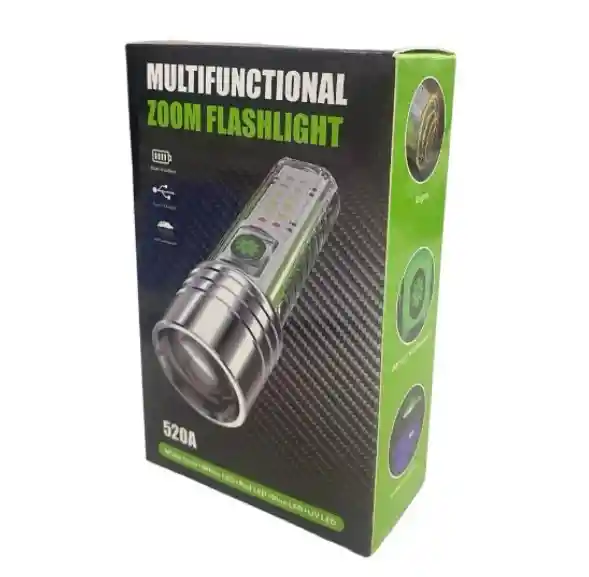 Linterna Recargable Z520 A: Iluminación Avanzada Para Todas Las Ocasiones La Linterna Recargable Z520 A está diseñada para ofrecerte una experiencia de iluminación eficiente y práctica, adaptándose a diferentes necesidades y entornos. Características clave: Potencia y alcance: El chip LED blanco 5050 genera un brillo de 500 lúmenes y alcanza distancias de hasta 100 metros. Multifuncionalidad: Luz principal: Alta intensidad para largas distancias, baja intensidad para ahorro de energía y estroboscópica para señalización. Luz lateral: Blanca para uso práctico, UV para inspección y roja/azul para emergencias. Diseño ergonómico: Fácil de manejar con un botón multifunción intuitivo. Duración prolongada: Mantiene el rendimiento incluso en usos prolongados. Ventajas: Práctica y portátil: Perfecta para aventuras al aire libre, campamentos o reparaciones nocturnas. Diseño magnético: Úsala como lámpara fija en superficies metálicas.