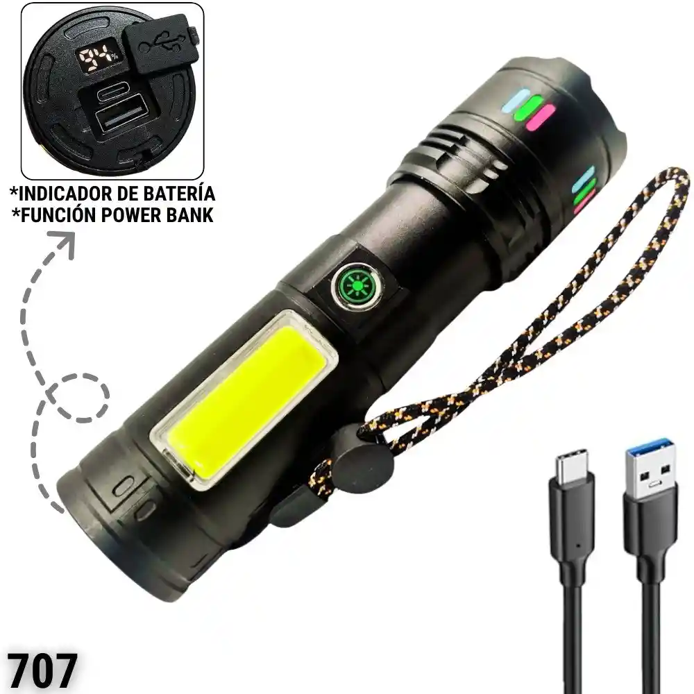 Linterna Tactica Led Con Power Bank Recargable Con Zoom 707 Con Cordon Ilumina cualquier aventura y mantente siempre conectado con nuestra nueva Linterna Táctica Multifuncional. Diseñada para la versatilidad, esta linterna combina una potente iluminación LED con la capacidad de cargar tus dispositivos móviles, convirtiéndola en el accesorio 2 en 1 perfecto para camping, trabajo, hogar o emergencias. Características: - Función Power Bank: Integra un puerto de salida USB. Si tu celular se apaga en el momento menos oportuno, esta linterna funciona como una batería externa para devolverte a la vida. - Indicador de Batería: A diferencia de otras linternas, esta cuenta con una pantalla en la base inferior que indica el porcentaje exacto de carga (0-100%). Sabrás con precisión cuándo es momento de recargarla. - Tecnología de Doble Luz: Foco Frontal: Haz de luz concentrado para larga distancia. Luz Lateral COB: Panel lateral de alta intensidad, ideal para usar como lámpara de mesa, reparar averías u otros. - Portabilidad: Incluye cordón de muñeca para un agarre seguro. - Recargable: Olvídate de comprar pilas desechables, gracias a su batería recargable podrás cuidar el planeta, adicionl de ahorrar. Especificaciones: - Modos de luz: Frontal Alta / Lateral COB. - Puerto de carga: USB Tipo C