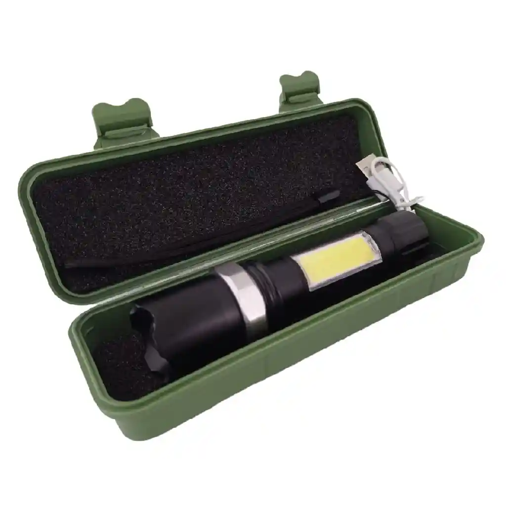 Esta exclusiva linterna led ha sido diseñada con los más altos estándares de calidad y fabricada con los mejores materiales, que hará de este el complemento perfecto para tu hogar y espacios, gracias a su sistema y novedosas funcionalidades podrás practicar tus deportes preferidos, es de facil uso, muy cómoda y de gran potencia de iluminación Características destacadas Material: Aluminio Tamaño Aprox.: 18 cm Tres tipos de luz: Luz fuerte / Luz tenue / Luz intermitente LED ultra blanco de alto brillo 180 Lúmenes Batería recargable de 3,7 V con hasta 180 minutos de duración lumínica aproximadamente Cuenta con batería 4,7V Li-ion interna Resistente a los golpes Zoom de luz regulable en forma gradual gracias a su sistema de perrilla Posee correa agarradera para mayor seguridad y evitar caídas Protegida contra salpicaduras Cuerpo con textura anti-rodamiento para un mejor agarre en la mano. Larga distancia y gran área de iluminación.