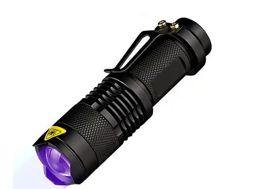 Linterna UV 365NM súper pequeña. Diseño antideslizante. Rango de enfoque ajustable para diferentes usos. Clip para mayor comodidad de transporte. El voltaje de funcionamiento es amplio y puede utilizar las baterías en la mayor medida. Adecuado para caza. ciclismo. escalada. camping y actividades al aire libre. etc.Características:- Color: Negro- Color de la luz: púrpura- Reflector: de la lente convexa de la- Material: aleación de aluminio- Modelo de LED: 365 NM LED- Interruptor: 1 Modo Batería: 1 * AA/1*14500 batería- Tamaño: 9.4*2.6*2.6 cm- Peso: 50g