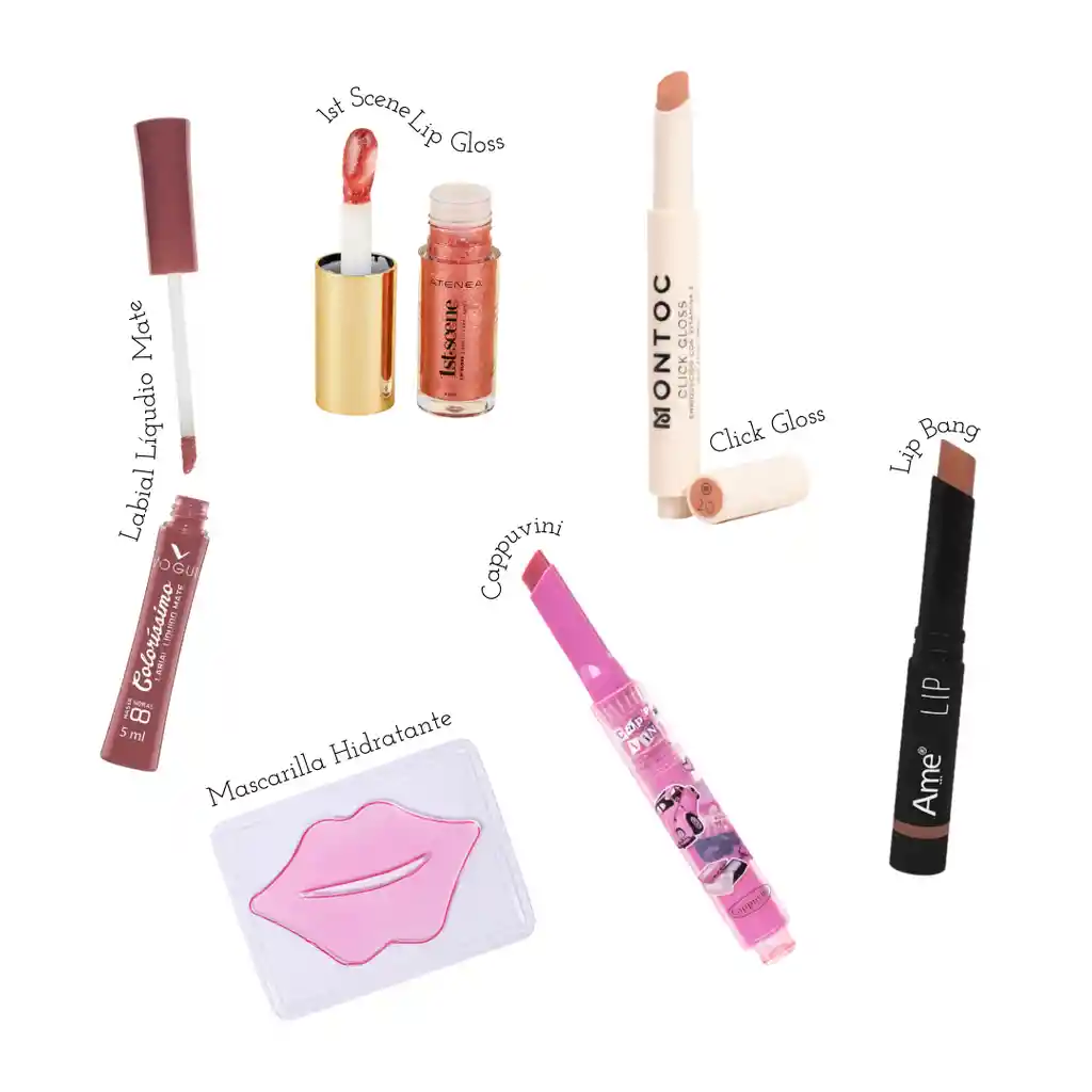 Incluye Brillo labial con color, 1st Scene Lip Gloss de la marca Atenea Brillo labial en barra con color de pigmentación tenue, Click Gloss de la marca Ame Labial liquido de acabado mate, Colorissimo de la marca Vogue Aceite hidratante para labios, Lip Oil de la marca Ruby Rose Labial en barra de acabado semimate, Lip Bang de la marca Ame Mascarilla hidratante para labios