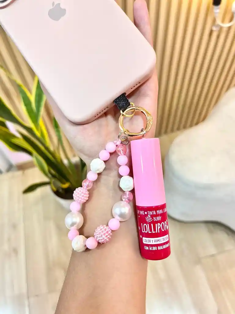 Tu kit rosado más cute y práctico en un solo accesorio! 🍓 Tinta para labios Berry Lollipop 💧 Con ácido hialurónico: color + humectación 💄 Acabado natural, ideal para uso diario 💖 Incluye llavero con perlas y bolitas decorativas 📱 Se puede colgar al celular o bolso — ¡Siempre contigo!