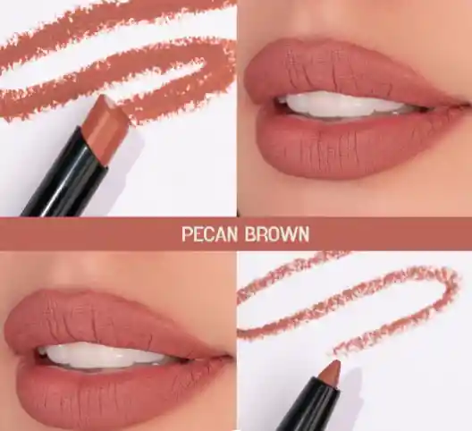 El lip liner + lipstick es cremoso y de larga duración. Viene con acabado mate, lo cual genera un efecto tinta con el paso del tiempo durante el día.