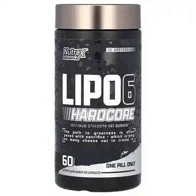 Transforma tu cuerpo con Lipo 6 Hardcore: la fórmula avanzada para maximizar la oxidación de grasa y tu rendimiento físico. Si estás buscando resultados reales y efectivos, **Lipo 6 Hardcore** de Nutrex Research es tu mejor aliado. Este potente suplemento está diseñado específicamente para acelerar la oxidación de grasa, aumentar tu energía y mejorar tu enfoque, ayudándote a lograr tus objetivos de una manera eficiente y sostenible. ¿Por qué elegir Lipo 6 Hardcore? 1. Fórmula de alta potencia para oxidar grasa: Lipo 6 Hardcore ha sido desarrollado con una combinación de ingredientes avanzados que favorecen la movilización de los depósitos de grasa y su conversión en energía útil. Esto te permitirá optimizar el uso de tus reservas energéticas mientras defines tu físico de manera natural. 2. Energía sostenida durante todo el día: Su mezcla de estimulantes te proporciona un impulso de energía inmediato que se mantiene durante horas. Ya sea que entrenes temprano en la mañana o en la tarde, sentirás cómo tu rendimiento se mantiene al máximo sin caer en picos y caídas de energía. 3. Control del apetito y mejor enfoque mental: Uno de los grandes desafíos al buscar oxidar grasa es controlar los antojos y mantener el enfoque en tus objetivos. Lipo 6 Hardcore te ayuda a reducir el apetito, lo que facilita mantener un régimen alimenticio, mientras te brinda un enfoque mental afilado para enfrentar tanto tus entrenamientos como las tareas diarias. 4. Tecnología de cápsulas líquidas de rápida acción: Cada dosis de Lipo 6 Hardcore está en una cápsula líquida de rápida absorción, asegurando que los ingredientes activos entren en acción rápidamente. Esto maximiza su efectividad para que puedas notar los resultados en menos tiempo. 5. Ideal para atletas y personas activas: Ya seas un atleta experimentado o alguien que está comenzando un nuevo estilo de vida saludable, **Lipo 6 Hardcore** se adapta a tus necesidades. Su fórmula versátil está diseñada para potenciar el rendimiento y acelerar el progreso hacia un cuerpo más definido y tonificado. Oxida grasa de forma eficiente, mejora tu energía y transforma tu enfoque con Lipo 6 Hardcore de Nutrex Research. No esperes más para alcanzar tus metas de acondicionamiento físico. ¡Ordena hoy y comienza a experimentar la diferencia en tu cuerpo y rendimiento! Presentación: 60 Cápsulas Servicios: 60 Serv