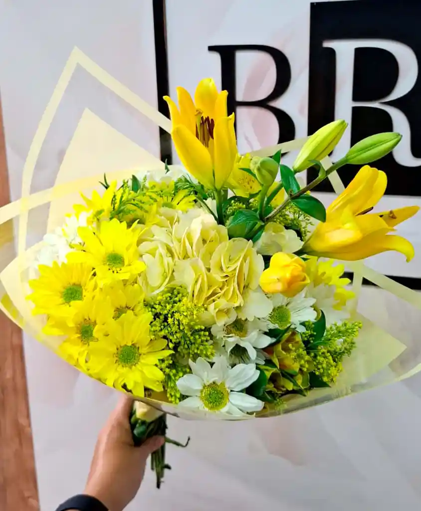 Hermoso Lirio acompañado con hortencia, Margarita, Soliaster y Astromelia. *El color de la flor puede variar segun disponibilidad en tienda.