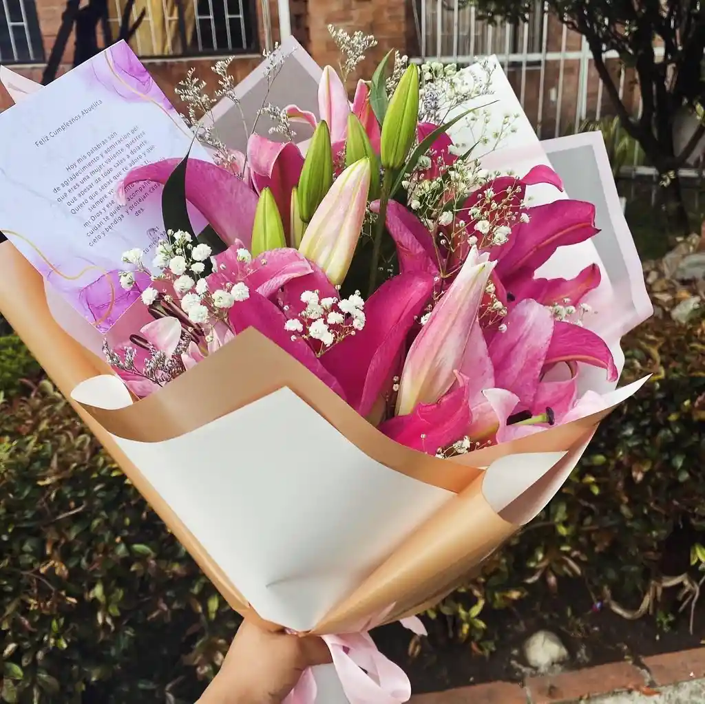 5 hermosos lirios de jardín con jipsu blanco envuelto en papel coreano
