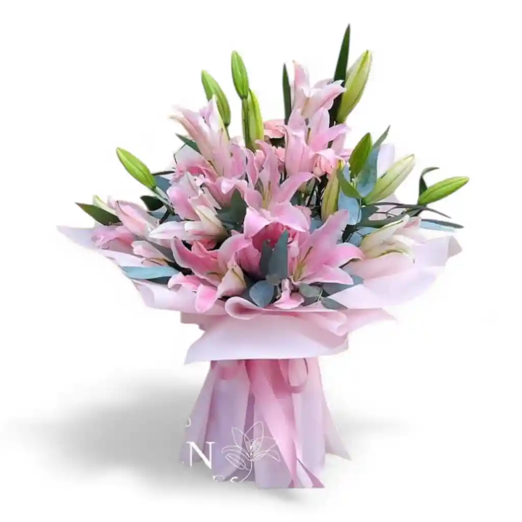 Arreglo elaborado en lirios rosados envuelto en papel coreano