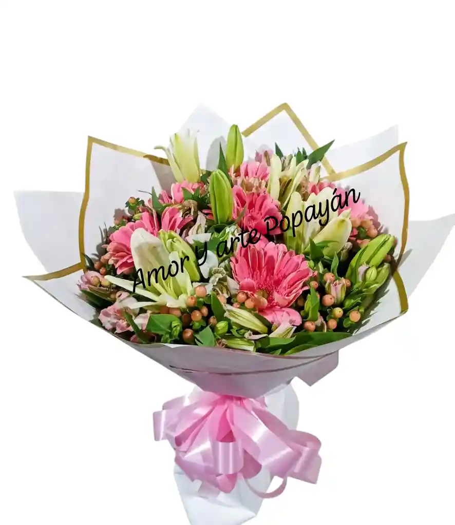Bouquet de lirios, gerberas y pajarito. Incluye: moño, tarjeta con mensaje personalizado, aroma, brillo.