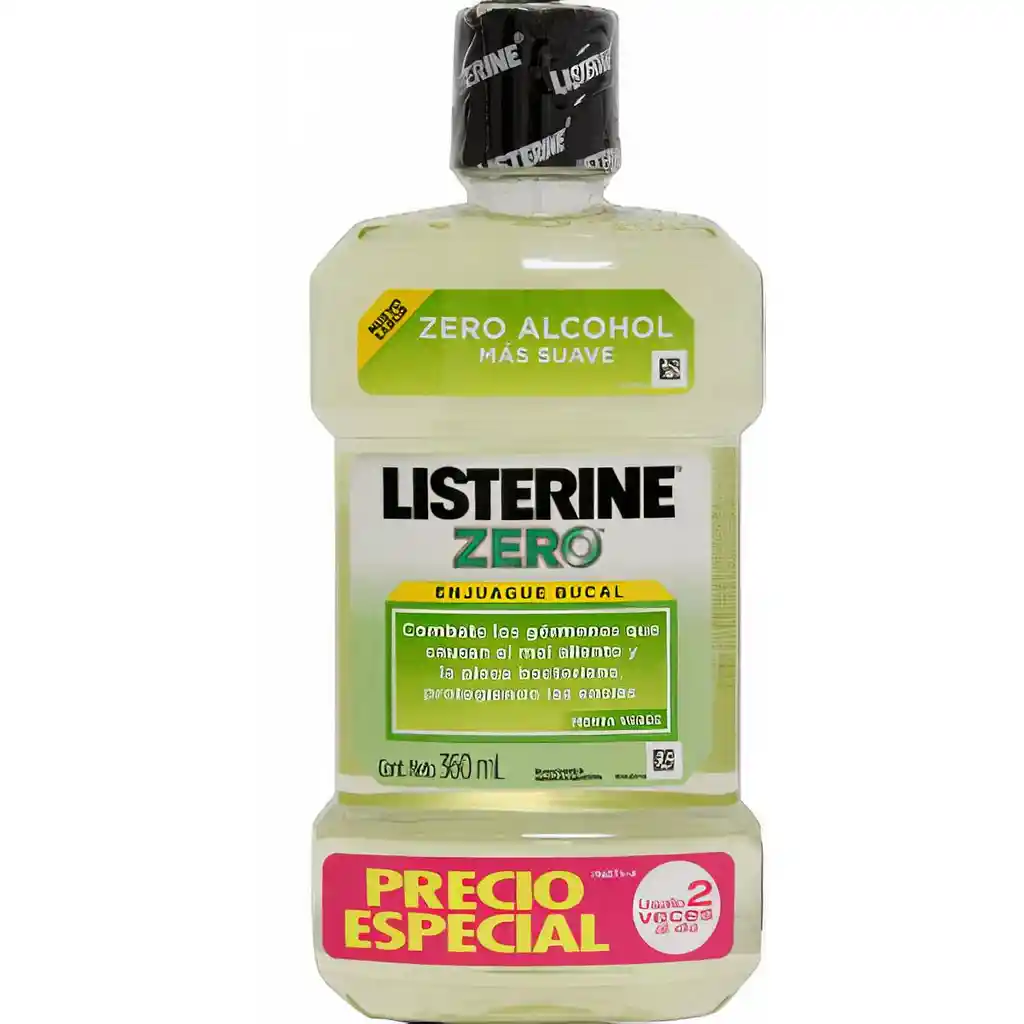 El enjuague bucal Listerine® Zero Menta Verde es libre de alcohol y brinda un sabor más suave. ayuda a combatir los gérmenes que causan el mal aliento y la placa bacteriana protegiendo las encías.