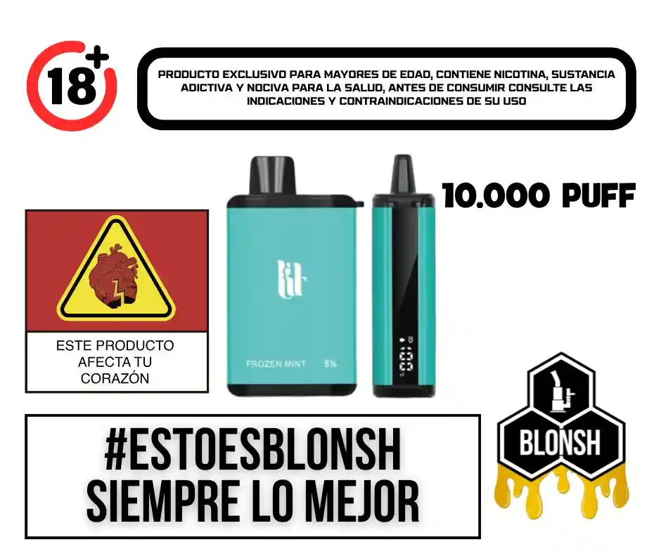¡Descubre la revolución del vapeo con nuestro Lit Vape 10,000 Puffs! Este innovador dispositivo te ofrece una experiencia incomparable con una asombrosa capacidad de 10,000 inhalaciones por carga. Diseñado para superar tus expectativas, nuestro Vape 10,000 Puffs cuenta con características avanzadas que lo convierten en el compañero perfecto para tus aventuras de vapeo. Equipado con una pantalla LED integrada, nuestro Vape 10,000 Puffs te brinda información en tiempo real sobre el nivel de batería y la cantidad de líquido restante, lo que te permite estar siempre al tanto de tu dispositivo y disfrutar de una experiencia de vapeo sin preocupaciones. Con indicadores de porcentaje de batería y líquido, nunca te quedarás sin energía ni tendrás que enfrentarte a la sorpresa de un vape vacío. El sistema Smart Dual Mesh Coil ofrece un rendimiento excepcional, con una producción de vapor abundante y un sabor puro en cada inhalación. Experimenta una calidad de vapeo superior con nuestro Vape 10,000 Puffs, diseñado para satisfacer incluso a los vapeadores más exigentes. Con una batería de 650mAh, nuestro Vape 10,000 Puffs ofrece una duración prolongada para que puedas disfrutar de sesiones de vapeo prolongadas sin interrupciones. Además, con un depósito de líquido de 18ml, este dispositivo te permite disfrutar de una experiencia de vapeo continua sin la necesidad de recargas frecuentes. Compacto, portátil y fácil de usar, nuestro Vape 10,000 Puffs es perfecto para vapeadores de todos los niveles de experiencia. Ya sea que estés explorando la ciudad o relajándote en casa, este dispositivo te ofrece la libertad de vapear con estilo y comodidad. Sabor: Frozen Mint (Menta congelada). Vape con capacidad para 10,000 puffs. Pantalla LED con indicadores de porcentaje de batería y líquido. Sistema Smart Dual Mesh Coil. Batería recargable de 650mAh. Capacidad de líquido de 18ml. Diseño compacto y portátil. Carga tipo C para una recarga rápida. 5% de sal nicotina = 50mg / ml.