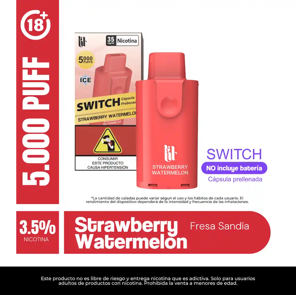 FRESA SANDIA. 3% NICOTINA. La CÁPSULA SWITCH Prellenada es la forma más práctica y potente de disfrutar tu vape. Diseñada para usarse con el KIT SWITCH, cada cápsula viene lista con 35mg de nicotina y ofrece hasta 5000 puffs de sabor intenso y consistente.