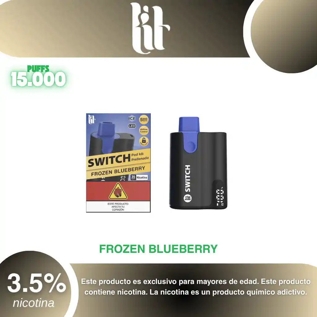 Lit Switch Kit Completo 5.000 Puffs Arandano Mentolado 3.5% PROHIBIDA LA VENTA A MENORES DE EDAD. ADVERTENCIA: ESTE PRODUCTO CONTIENE NICOTINA, LA NICOTINA ES UNA SUSTANCIA QUIMICA ADICTIVA Y NOCIVA PARA LA SALUD. Los líquidos para vapeo contienen: propilenglicol USP, glicerina USP, sabor artificial y nicotina. Este producto puede contener nicotina, una sustancia altamente adictiva que puede generar dependencia, posibles afectaciones arteriales, cardiacas, pulmonares y otras aun no identificadas. No se recomienda su uso a mujeres en embarazo, puede generar lesiones al feto. Mantener alejado de niños y mascotas. No ingerir, puede generar irritación y/o intoxicación. Por favor antes de consumir consulte a su médico posibles afectaciones o sensibilidad a alguno de sus componentes. Los componentes de este producto pueden aumentar la sensación de ansiedad En caso de notar alguna reacción adversa por favor suspenda su uso de manera inmediata. Siga las instrucciones en el envase. No alterar sus componentes. Adquiera sus productos en sitios de confianza No use productos piratas, alterados, o en los cuales no pueda comprobar su buena procedencia, Verifique la reputación del fabricante y distribuidor antes de adquirir cualquier producto Si no es usuario fumador o vapeador no se recomienda su uso bajo ninguna circunstancia Al usar este producto usted es consciente que este producto puede generar afectaciones a su salud, incluyendo aquellas que a la fecha de la compra no se han identificado y que pueden aparecer a largo plazo