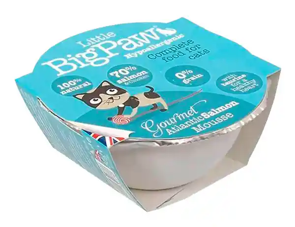 Little Big Paw Cat Gourmet , Mousse de Salmon Atlantic, es un alimento completo húmedo con delicada textura de mousse 100% natural e hipoalergénico diseñado nutricionalmente para gatos adultos.