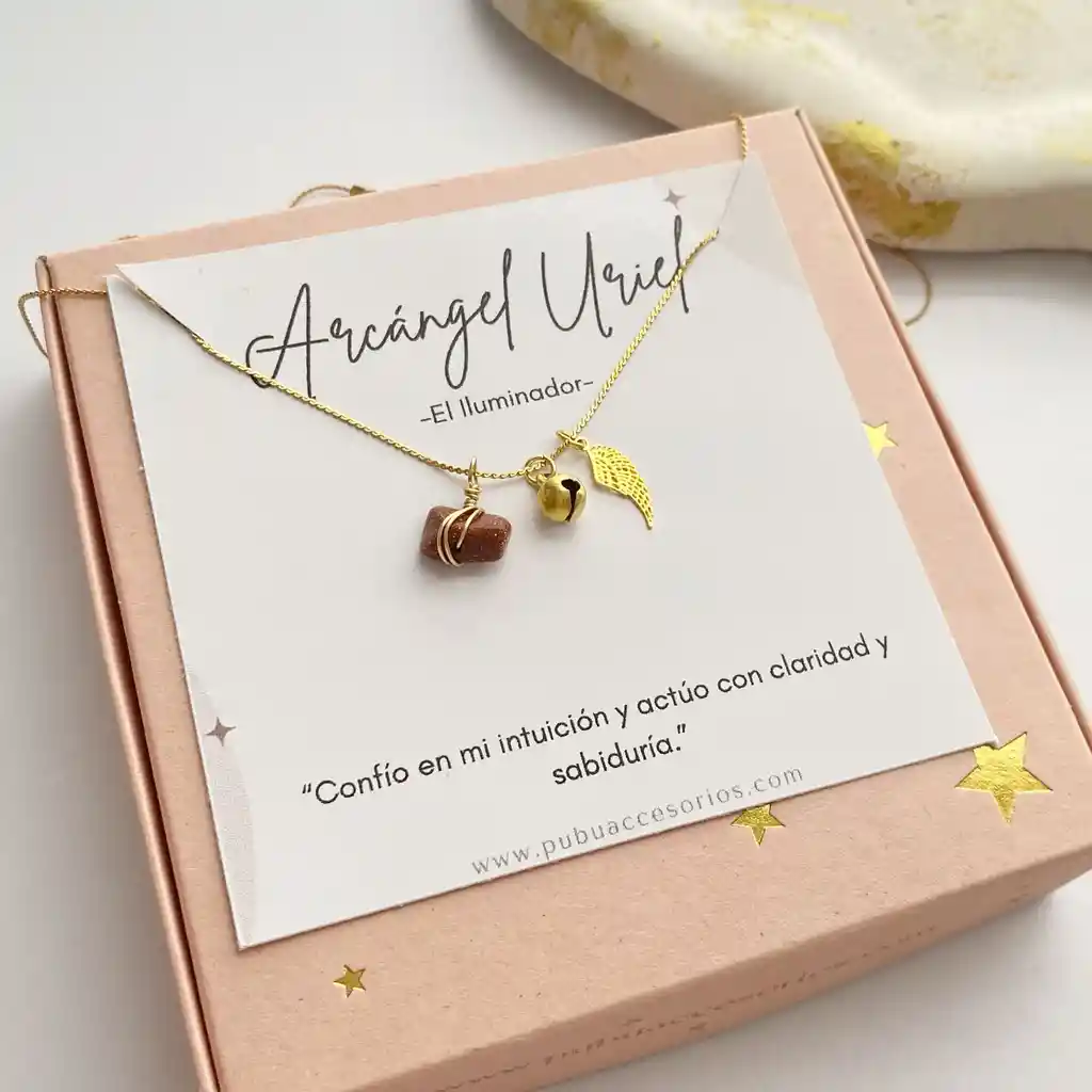 LA1-1 🔥 Arcángel Uriel – El Iluminador 💛🌞Cuarzo: Lluvia de oro Propósito: Sabiduría, decisiones claras, despertar interior.Afirmación: “Confío en mi intuición y actúo con claridad y sabiduría.” 🔮 Ritual: El viernes por la mañana, ponte el collar mientras miras al sol. Visualiza rayos dorados entrando en tu mente. Repite la afirmación y escribe una intención clara para ese día. 🗓️ Día de conexión: Viernes
