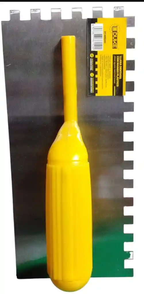 Llana dentada con mango plástico amarillo, ideal para trabajos rápido y duradero, producto de alta calidad.