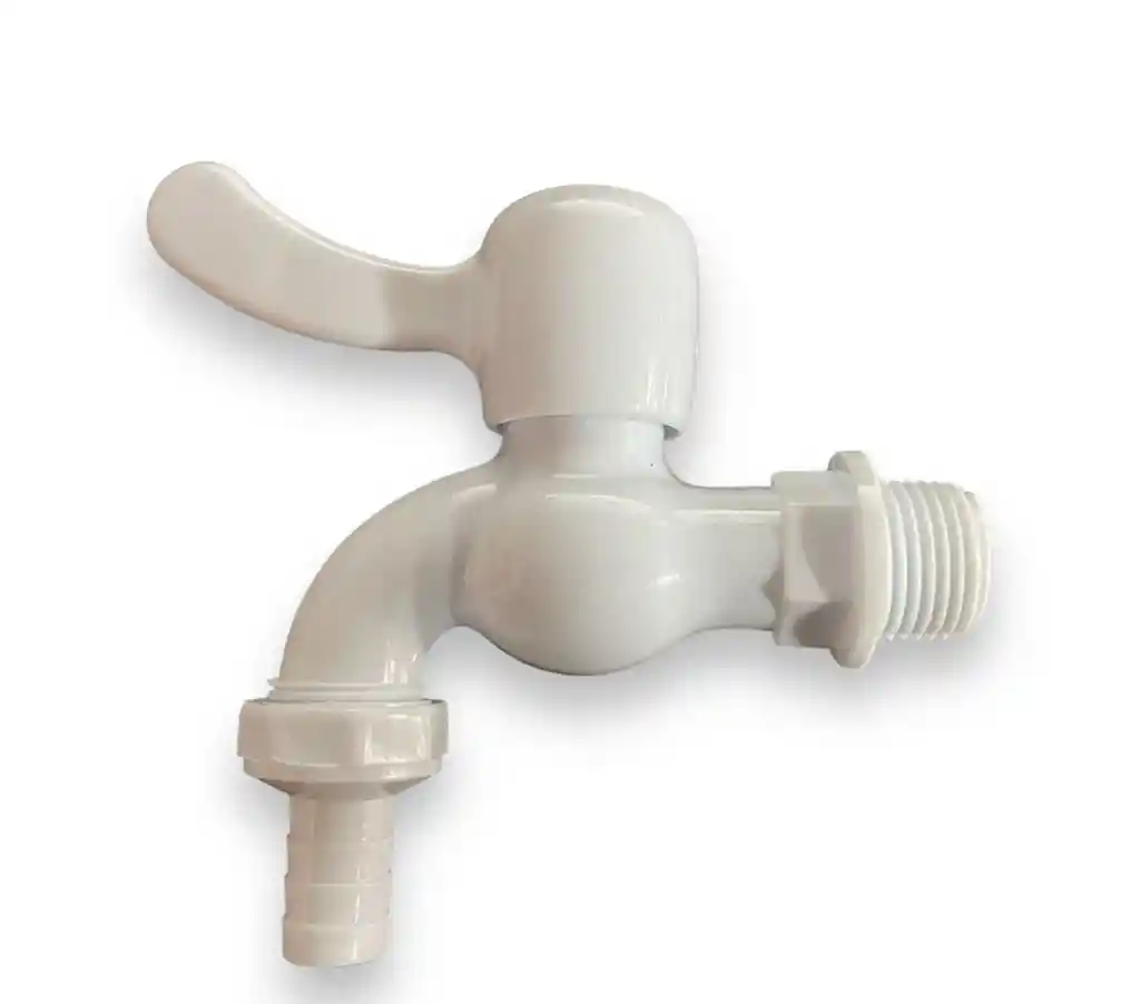 Llave jardín plástica. Especificaciones: Entrada: 1/2'' (12.7mm) Rosca de entrada: 6 cuerdas Rosca de salida: 3 cuerdas Salida: 3/4'' (19mm) Cuerpo fabricado en plástico.