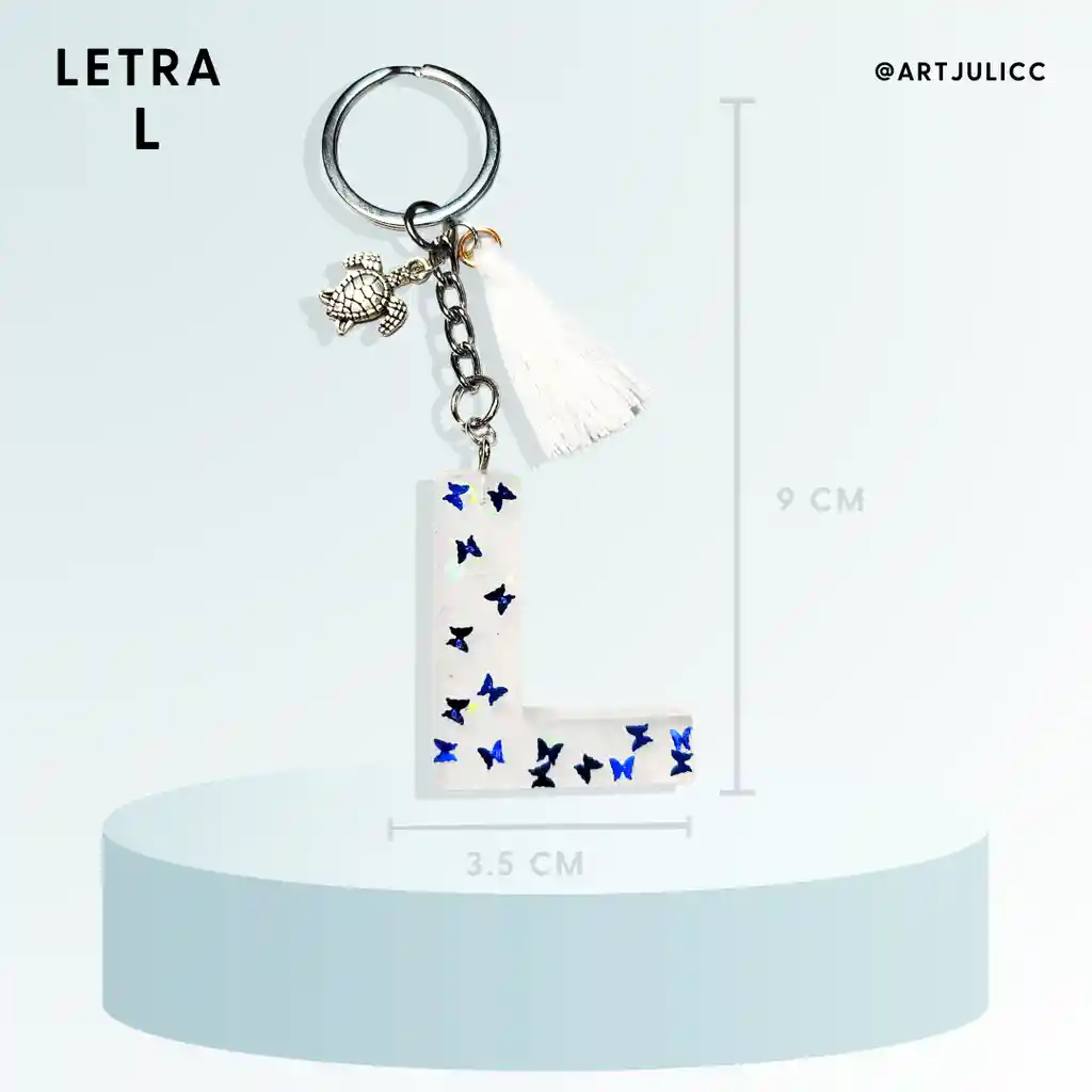 LLAVERO LETRA L EN RESINA , CON DIJE Y BORLA DECORATIVA COLOR BLANCO CON MARIPOSAS AZULES