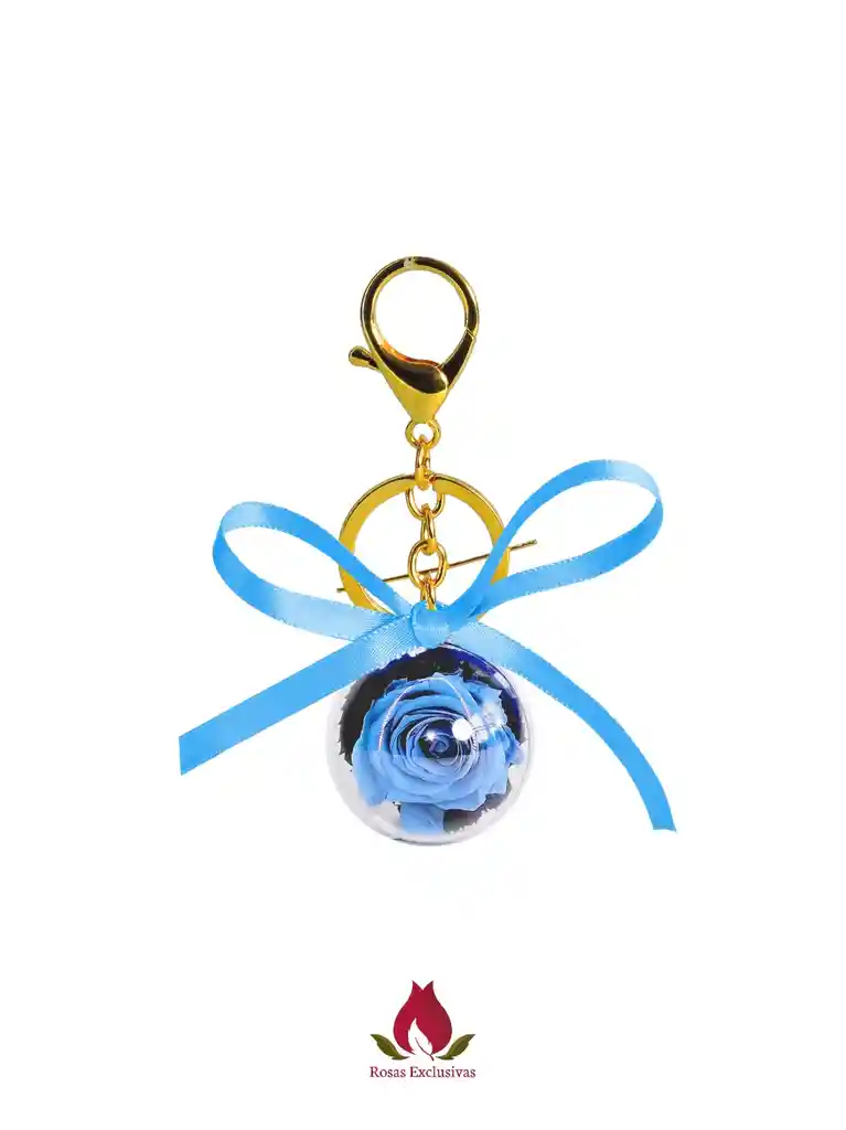 Llavero mini de rosa preservada azul claro de 4-5 cms de diámetro con duración aproximada de 1 año, incluye decoración con pétalos, cintas, carta de cuidados y bolsa de papel. Un detalle para cualquier ocasión.