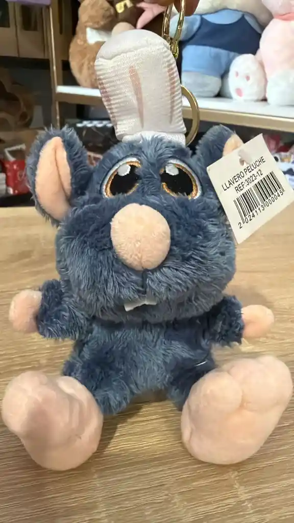 Peluche de la rata Remy en color gris azulado. Incluye un gorro de chef blanco alto con detalles de líneas suaves, nariz rosada, orejas grandes y un diente frontal blanco. Viene con gancho metálico dorado para colgar.