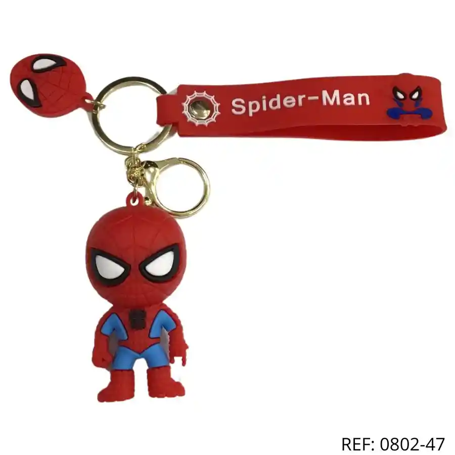 Llavero Spider-Man clásico con cinta roja. Diseño divertido, ideal para fans del superhéroe arácnido.