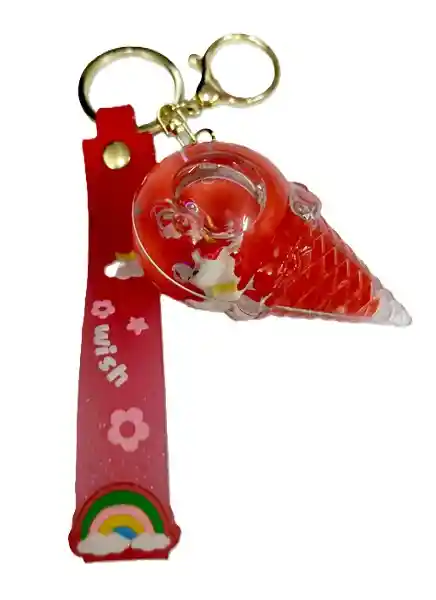 El llavero es en forma de cono y dentro gel con figuritas flotantes como un hermoso unicornio.