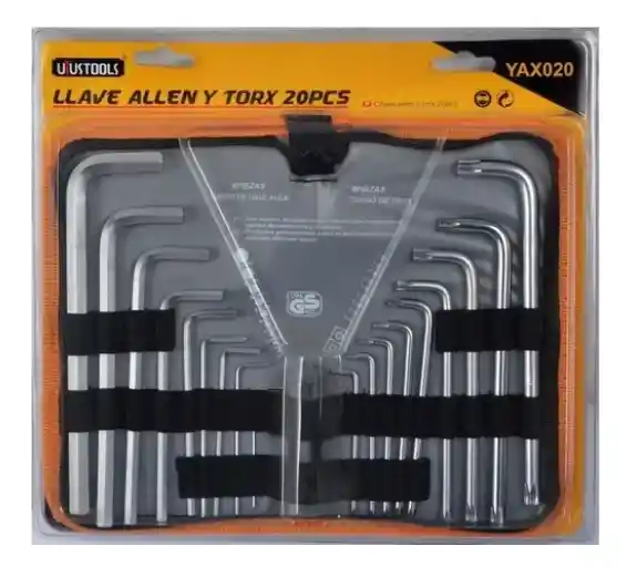 CARACTERÍSTICAS Material: acero cromo vanadio Cantidad de piezas: 20 Incluye: • 9 llaves Torx en forma de L – T50, 16cm de largo, 3cm ancho – T45, 14.5cm de largo, 2.5cm de ancho – T40, 13cm de largo, 2.5cm de ancho – T30, 11.5cm de largo, 2.2cm de ancho – T27, 10.5cm de largo, 1.7cm de ancho – T25, 9.5cm de largo, 1.5cm de ancho – T20, 9cm de largo, 1.3cm de ancho – T15, 8cm de largo, 1.1cm de ancho – T10, 7.5cm de largo, 1.1cm de ancho • 9 llaves Allen en forma de L hexagonal – 10mm, 16.5cm de largo, 4cm de ancho – 8mm, 14.5cm de largo, 3.5cm de ancho – 6mm, 13.5cm de largo, 3cm de ancho – 5mm, 11cm de largo, 2.8cm de ancho – 4mm, 9.5cm de largo, 2.5cm de ancho – 3mm, 8.5cm de largo, 2cm de ancho – 2.5mm, 8.2cm de largo, 1.7cm de ancho – 2mm, 7.3cm de largo, 1.5cm de ancho – 1.5mm, 6cm de largo, 1.3cm de ancho 1 cilindro plástico de 7cm con 6 orificios de diferentes medidas para poner las llaves en uso. 1 estuche con cierre tipo “cartuchera” donde se ubican todas las la piezas Presentación: En blíster • Marca: Uyustools