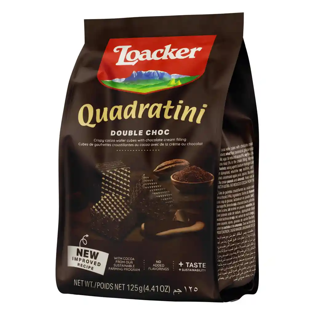 Las galletas italianas quadratini doble chocolate son una combinación exclusiva de felicidad crujiente y cremosa con notas de cacao agridulce de la oblea