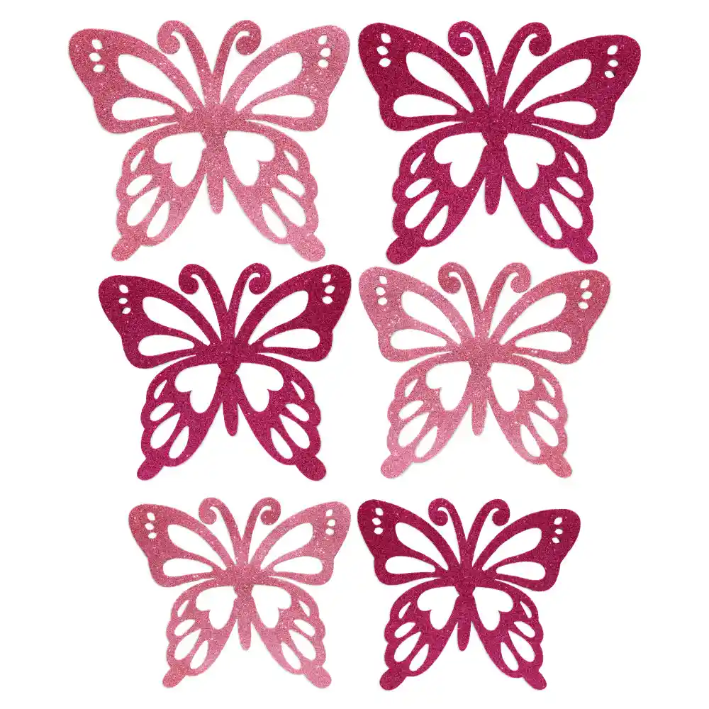 El paquete trae 6 mariposa, y en tres tamaños diferentes para decorar Tamaño: Grande: 17.4 x 21 cm Mediana: 14.4 x 17 cm Pequeña: 12.6 x 10.7 cm Material: Fomi