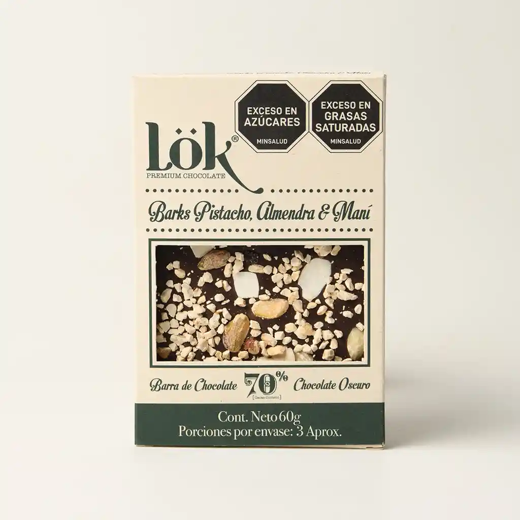 Chocolate 70 % contenido de cacao con pistacho, almendra y maní. Los frutos secos siempre han acompañado al chocolate, por esta razón creamos nuevas formas de disfrutar esta mezcla tradicional. Trozos de maní, almendra y pistacho con chocolate 70 % cacao, una combinación perfecta para cualquier ocasión.