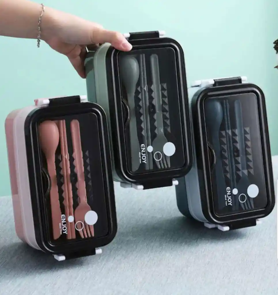 Esta elegante y linda lonchera Enjoy la podrás llevar contigo al colegio, universidad u oficina, es súper práctica, tiene 3 compartimientos de gran espacio que te permitirá llevar diferentes alimentos, perfectos para el día a día, mientas almuerzas podrás poner tu celular en la tapa de los cubiertos y disfrutar de videos, películas o series, viene en 3 colores (Rosa, Azul y verde) Características: Es libre de BPA Material : polipropileno Sellado sin fugas Tiene un orifivio de ventilación Es fácil de abrid, tiene broche de presión Anillo de silicona integrado en la tapa Es desmontable y fácil de limpiar Que Incluye: 1 Lonchera Cubirtos (cuchara, tenedor y palitos chinos)