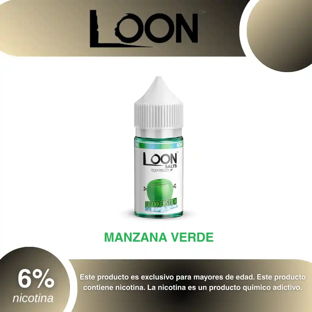 Loon Salt 30 ML, Sabor Manzana Verde Mentolada 6%. PROHIBIDA LA VENTA A MENORES DE EDAD. ADVERTENCIA: ESTE PRODUCTO CONTIENE NICOTINA, LA NICOTINA ES UNA SUSTANCIA QUIMICA ADICTIVA Y NOCIVA PARA LA SALUD. Los líquidos para vapeo contienen: propilenglicol USP, glicerina USP, sabor artificial y nicotina. Este producto puede contener nicotina, una sustancia altamente adictiva que puede generar dependencia, posibles afectaciones arteriales, cardiacas, pulmonares y otras aun no identificadas. No se recomienda su uso a mujeres en embarazo, puede generar lesiones al feto. Mantener alejado de niños y mascotas. No ingerir, puede generar irritación y/o intoxicación. Por favor antes de consumir consulte a su médico posibles afectaciones o sensibilidad a alguno de sus componentes. Los componentes de este producto pueden aumentar la sensación de ansiedad En caso de notar alguna reacción adversa por favor suspenda su uso de manera inmediata. Siga las instrucciones en el envase. No alterar sus componentes. Adquiera sus productos en sitios de confianza No use productos piratas, alterados, o en los cuales no pueda comprobar su buena procedencia, Verifique la reputación del fabricante y distribuidor antes de adquirir cualquier producto Si no es usuario fumador o vapeador no se recomienda su uso bajo ninguna circunstancia Al usar este producto usted es consciente que este producto puede generar afectaciones a su salud, incluyendo aquellas que a la fecha de la compra no se han identificado y que pueden aparecer a largo plazo