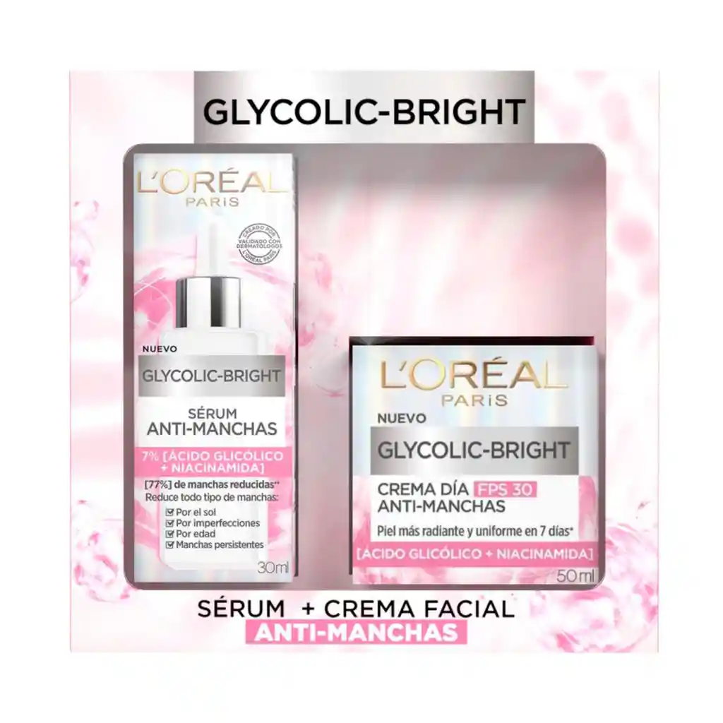 El pack Glycolic Bright ofrece una rutina facial pensada para que potencies la uniformidad del tono y atiendas la apariencia de manchas mediante la acción combinada del sérum de 30 mL y la crema facial de 50 mL con FPS 30, formulados con ácido glicólico y niacinamida, dos ingredientes conocidos por contribuir a una piel con aspecto más luminoso y homogéneo; el sérum tiene una textura ligera adecuada para uso diario, mientras que la crema complementa la rutina con hidratación y protección solar, de modo que mantengas una aplicación continua que favorezca una apariencia más pareja en el rostro. Información del producto Loreal Pack Glycolic Bright Serum 30 mL + Crema 50 mL ofrece una rutina facial complementaria formulada con ácido glicólico y niacinamida | combinación que contribuye a mejorar la apariencia de manchas y apoyar un tono más uniforme | incluye un sérum de textura ligera adecuado para uso nocturno y una crema facial con FPS 30 indicada para el día | ambos productos pueden utilizarse en rutinas de cuidado regular aplicando el sérum sobre el rostro limpio y la crema como último paso diurno para complementar hidratación y protección. Hecho en Colombia.