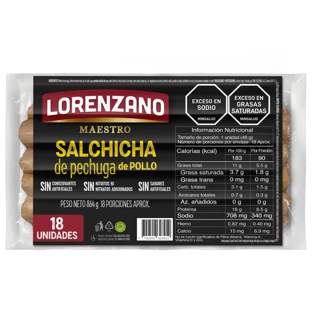 Salchicha de pechuga de pollo Lorenzano | Cantidad: 18 unidades | Peso neto: 864 g / 30.47 oz | Libre de Conservantes, Nitrato y Conservantes artificiales | Textura Suave y Jugosa | Sabor natural y equilibrado | Mantener refrigerado según indicaciones del empaque | País de Origen: Colombia.