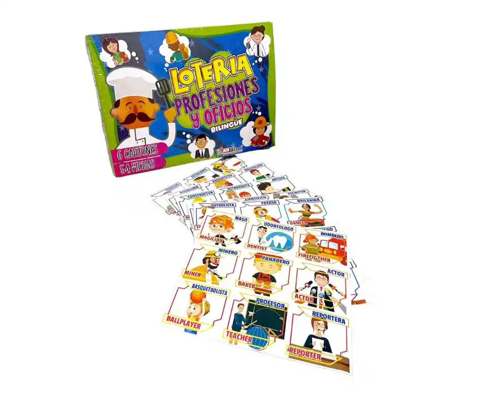 Saludos Comunidad DISPONIBLE PARA LA VENTA Juego Lotera Profesiones y Oficios BILINGUE. Aprende de forma Divertida los tipos de Trabajos y empleos en ingles y español, Identificando figuras e imágenes. CONTENIDO: 6 CARTONES - 54 FICHAS **Compre con seguridad y confianza** SOMOS INVERSIONES WOLF