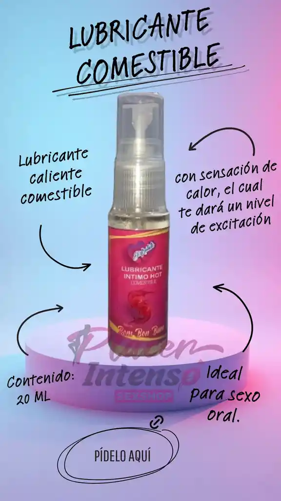 Lubricante caliente comestible para sexo oral. Aplica en la zona deseada, pezones, clítoris, pene o ano frótalo con tus dedos realizando un masaje, luego soplas para sentir su sensación de calor, el cual te dará un nivel de excitación mucho mas extraordinaria y por ultimo cómelo con muchas ganas.