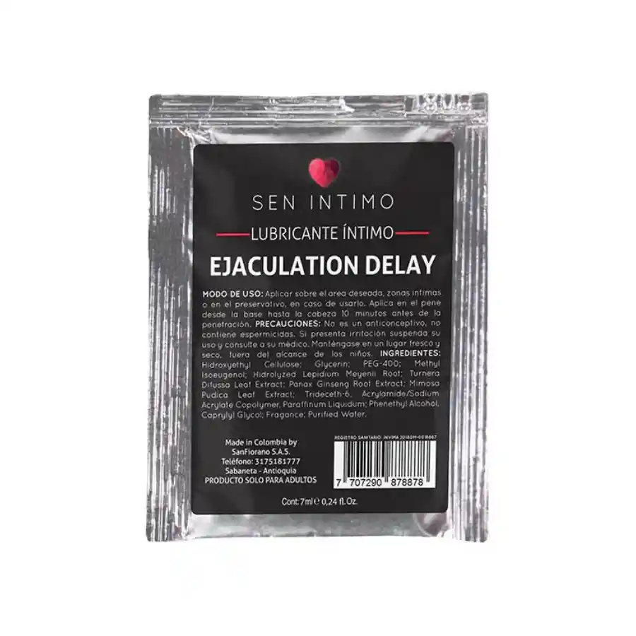 Experimenta un placer prolongado con el Retardante Ejaculation Delay, una fórmula de máxima potencia diseñada para ayudarte a controlar tu rendimiento en la intimidad. Características: • Potencializa la erección • Ligero, No es pegajoso • Contenido: 7 Ml Registro Sanitario Invima: 2022DM-0025864 Modo de uso: Rocea 2 o 3 veces desde la base del pene hasta la cabeza, 10 minutos antes de la penetración. Deja que la fórmula actúe para disfrutar de una experiencia más duradera y Precauciones: En caso de presentar reacciones alérgicas o irritación, suspender el uso y consultar a un especialista. Mantener alejado de los ojos y oídos. Mantener fuera del alcance de los niños y animales. No usar en caso de observar el empaque alterado o deteriorado. Consérvese en un ambiente fresco y seco (15° a 30° C). Confidencialidad: Tu producto llega en empaque 100% discreto, cuidamos tu privacidad.